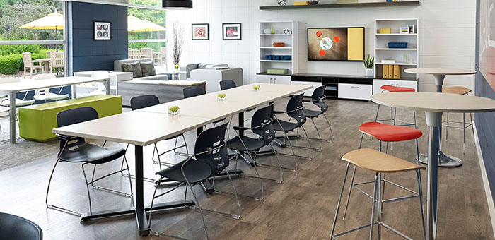 咖啡馆空间经常服用的专用会议室的地方 - 用房地产更加灵活的方式。轻质座椅和桌子可以很容易地调整,以满足眼前的需求,无论是吃午餐,合作或工作独奏。