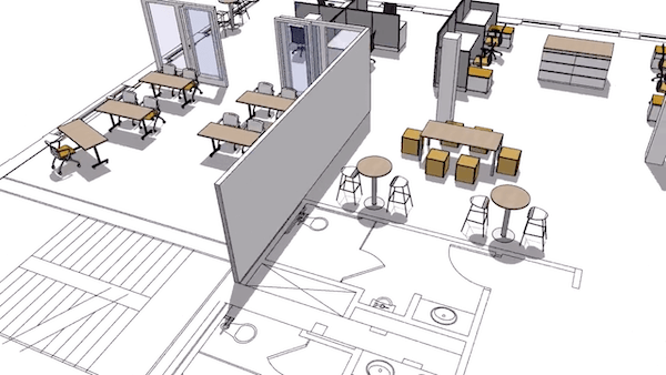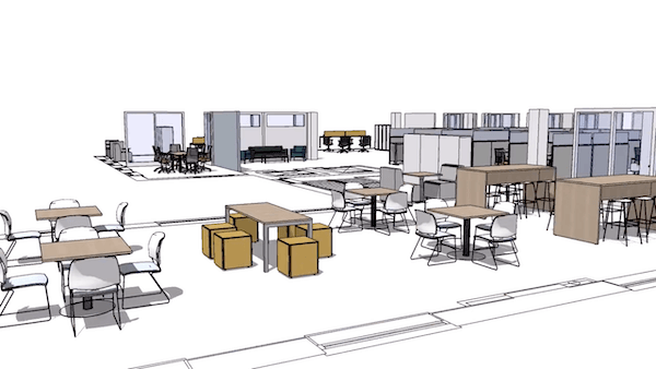 When it comes to collaboration, there’s nothing like an open office. But that doesn’t eliminate the need for privacy. These pinwheel-shaped workstations are perfect for workers looking to touch down, send an email, or focus on work. There are also spaces for teams to collaborate in semi-privacy, or workers to meet up for a quick chat.